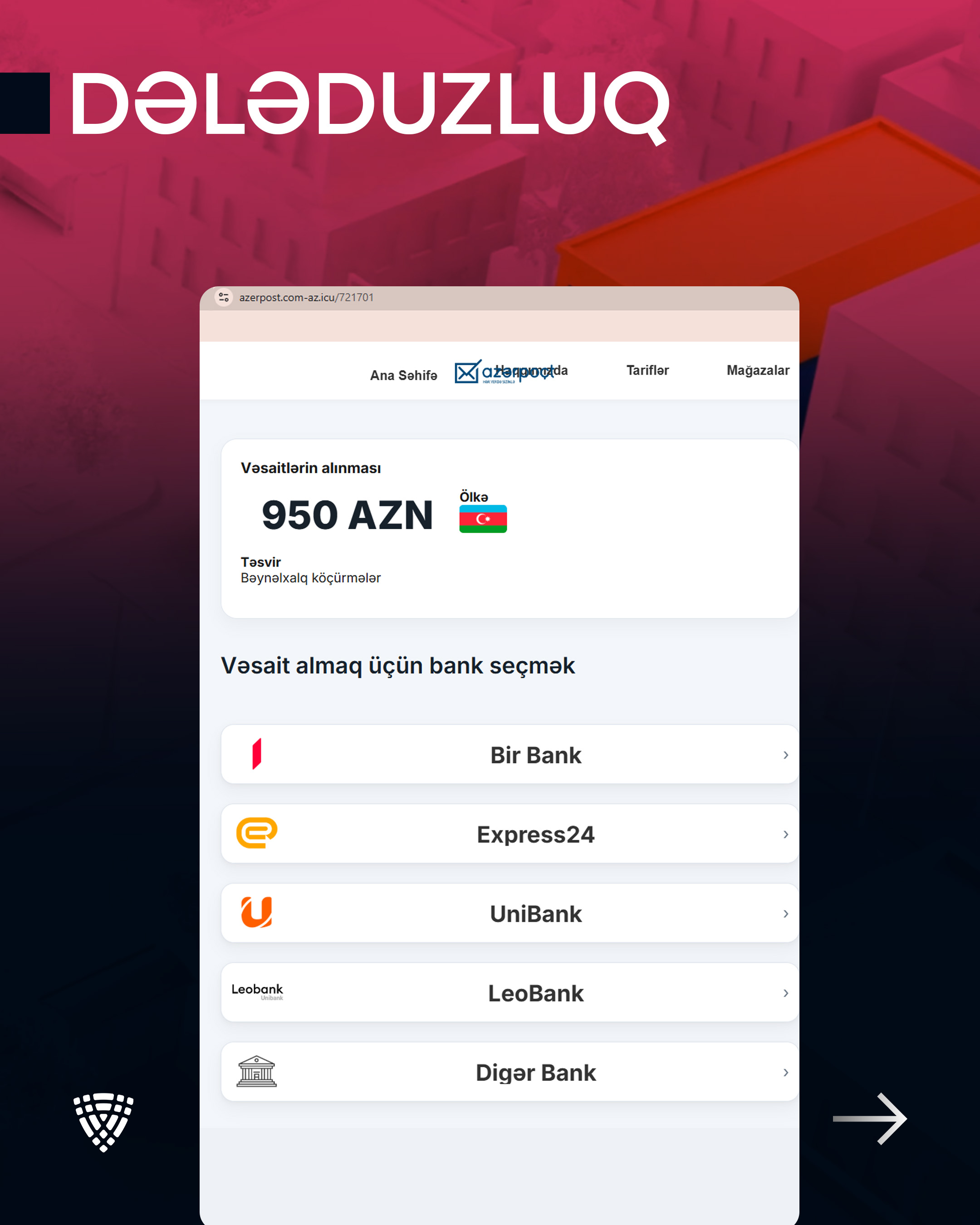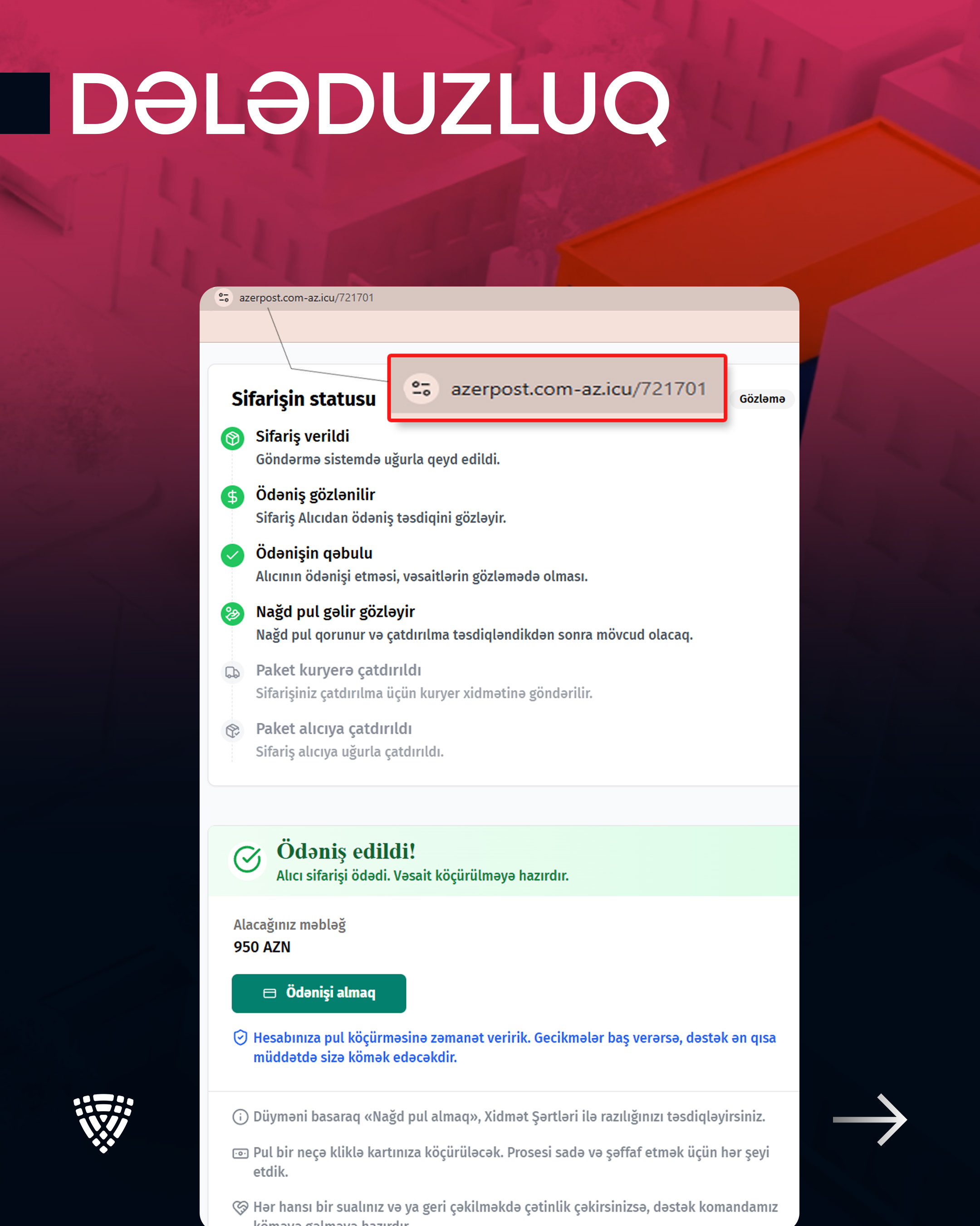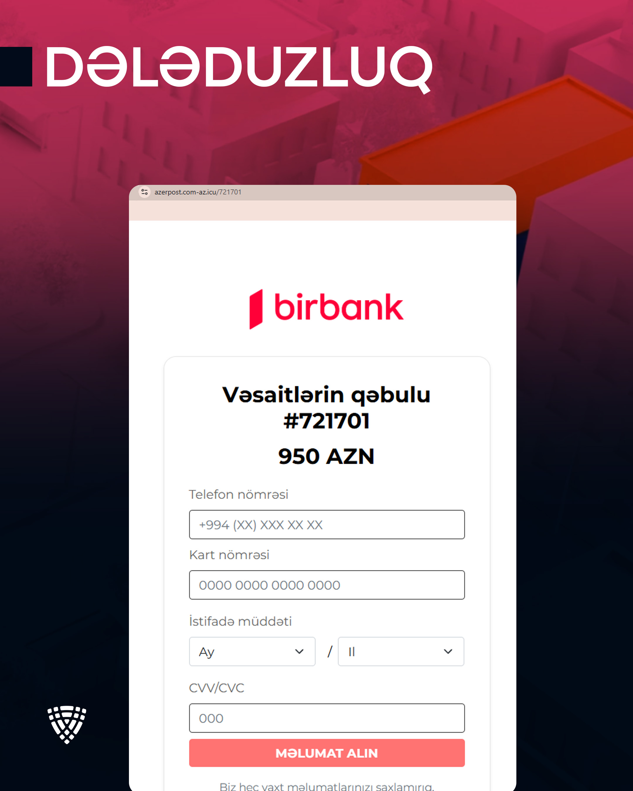 Rəqəmsal İnkişaf və Nəqliyyat Nazirliyinin nəzdində fəaliyyət göstərən Elektron Təhlükəsizlik Xidmətinin (ETX) müşahidələrinə əsasən, son günlər kiberdələduzlar "Azərpoçt" MMC-nin adı və loqosundan sui-istifadə edərək vətəndaşlara qarşı məqsədli fırıldaqçılıq kampaniyası həyata keçirirlər.