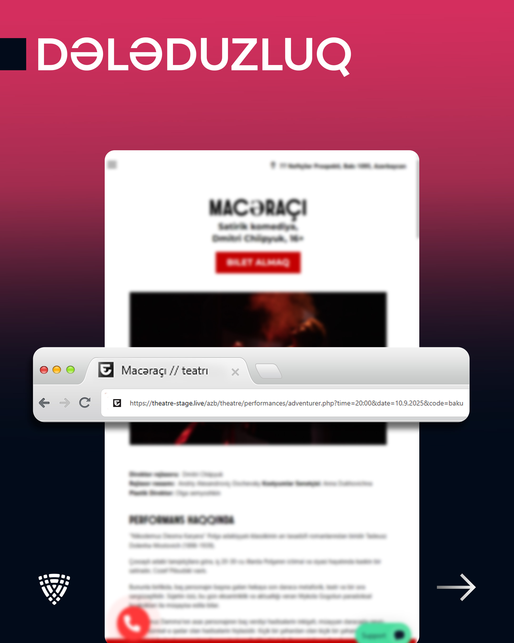 Dələduzlar öz məqsədlərini “theatre-stage.live” kimi saxta veb-səhifələr üzərindən həyata keçirirlər. Məhz bu keçid vasitəsilə endirimli və ya məhdud sayda bilet təklifi adı ilə vətəndaşları təcili hərəkət etməyə sövq edirlər. Bu üsulla onların bank kartı və digər fərdi məlumatlarını əldə etməyə çalışırlar.