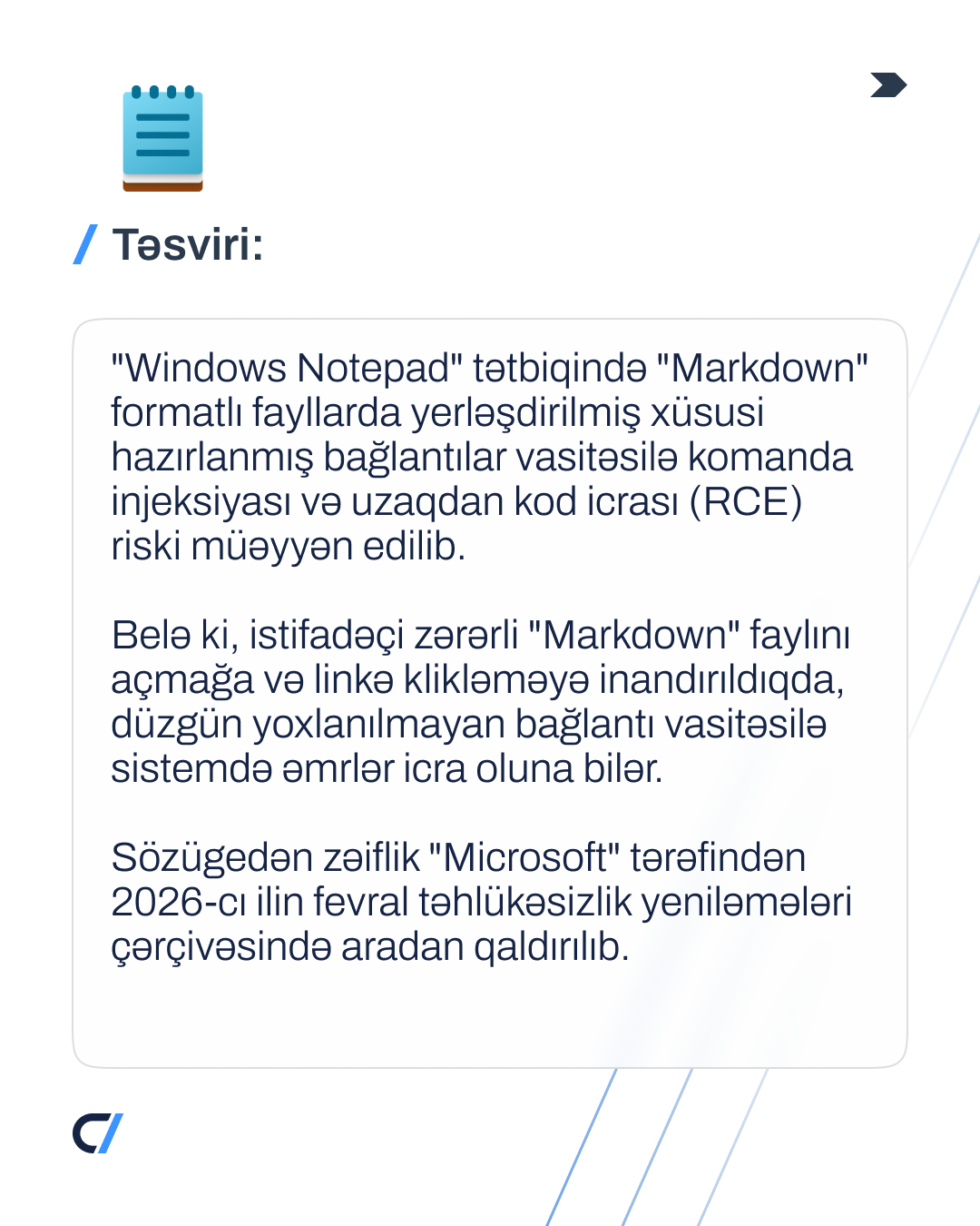 “Windows Notepad” proqramında uzaqdan kod icrası riski yaradan təhlükəsizlik boşluğu (CVE-2026-20841) aşkarlanıb.