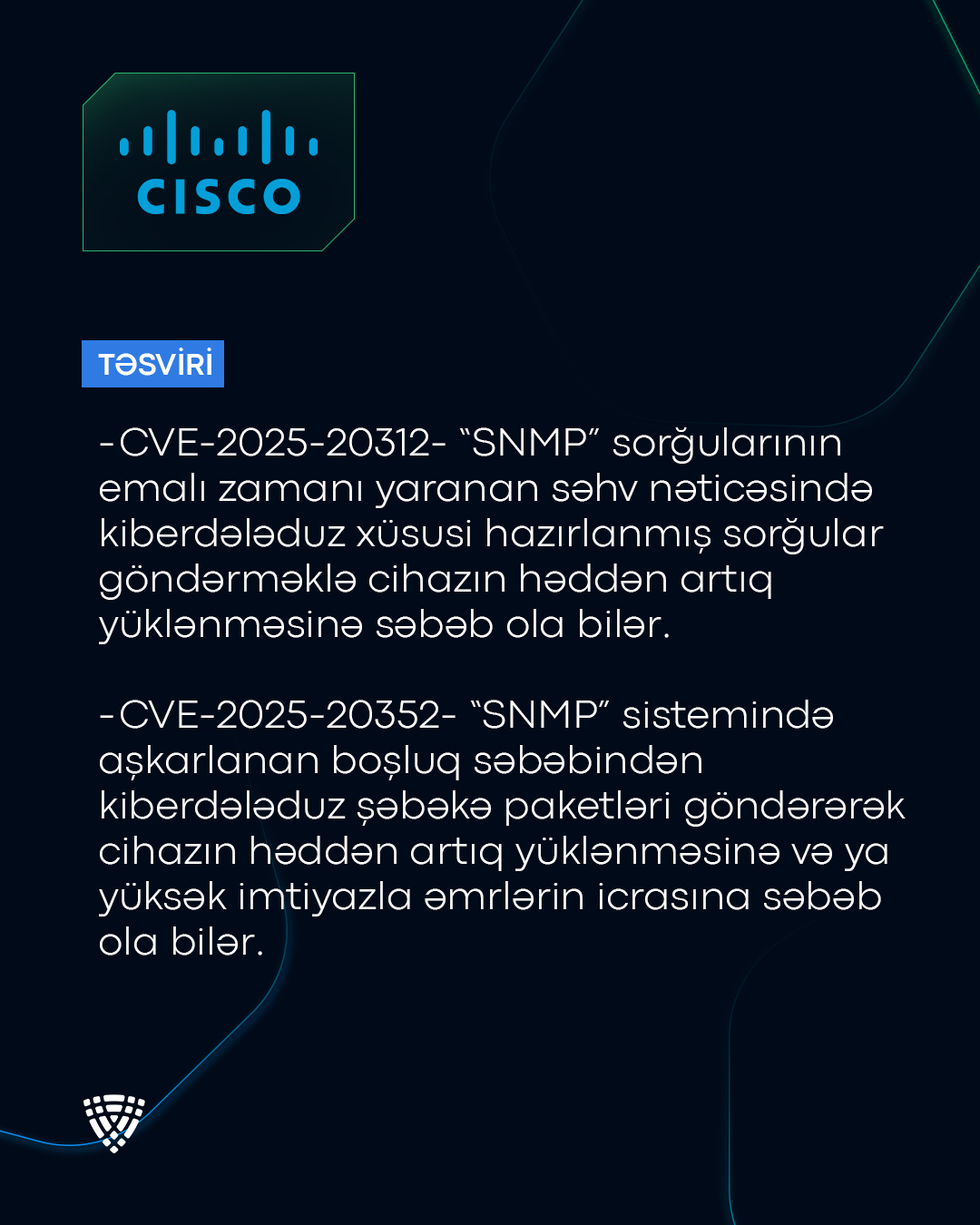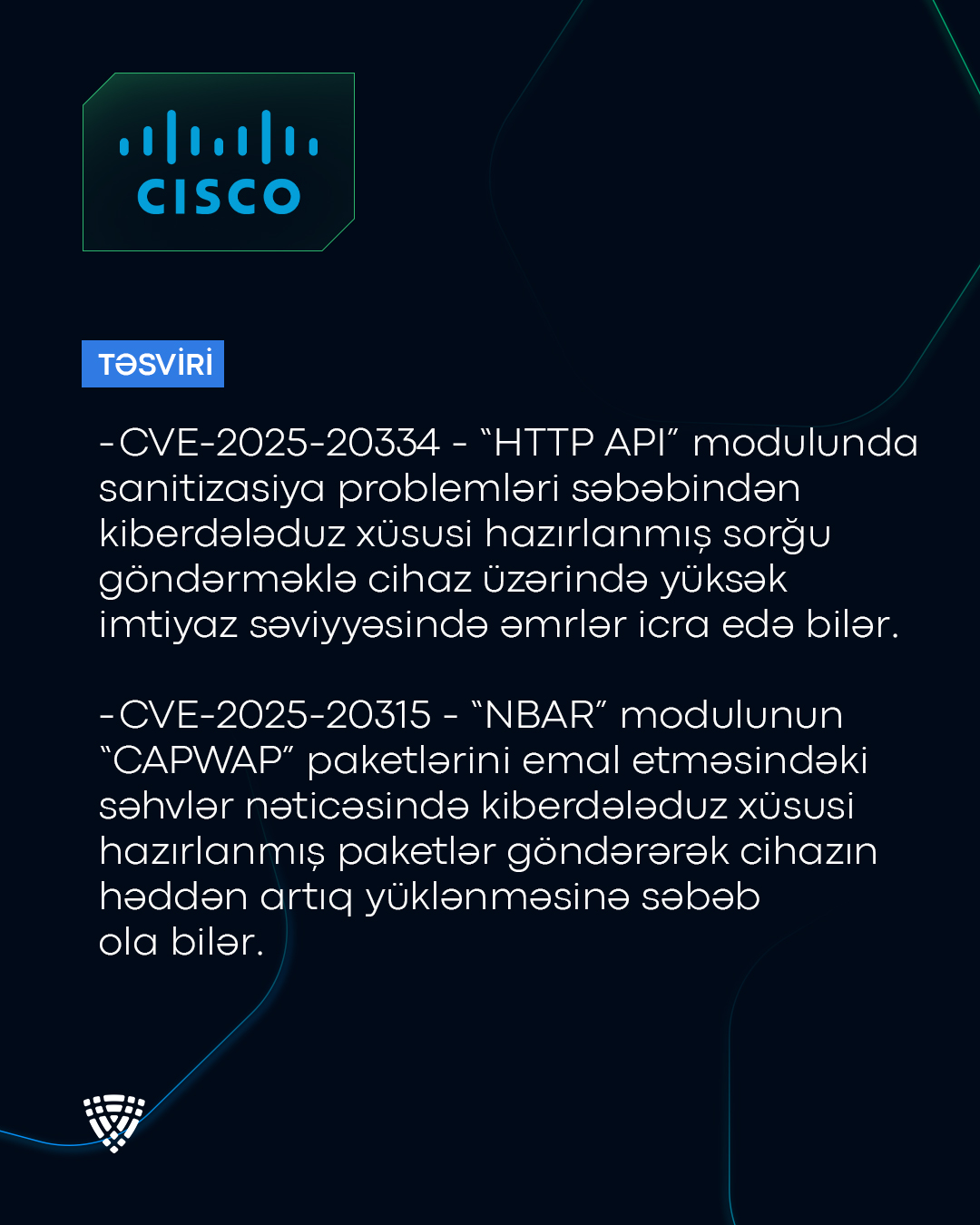 “CIsco IOS XE”də boşluqlar (CVE-2025-20334, CVE-2025-20315, CVE-2025-20312, CVE-2025-20352) aşkar olunub.