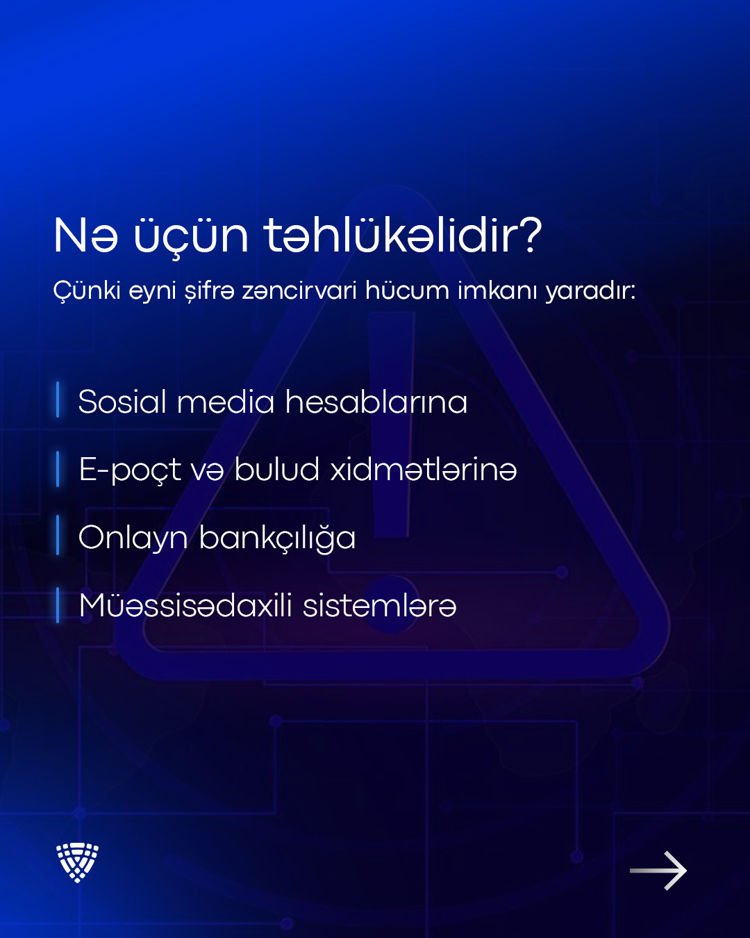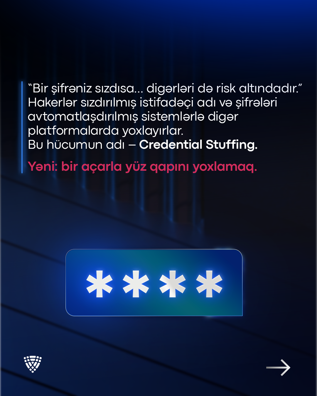 Credential stuffing – hakerlərin ələ keçirilmiş istifadəçi adı və şifrələri digər platformalarda sınayaraq hesablarınıza daxil olmağa çalışdığı bir hücum növüdür.